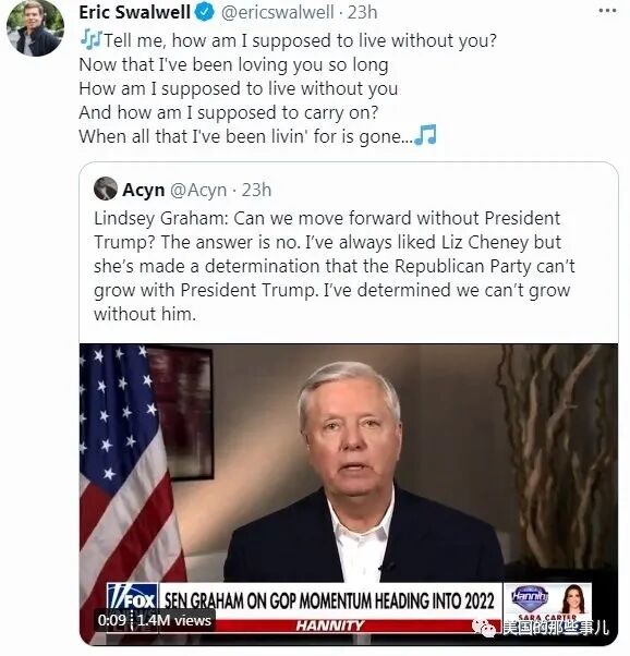 格林汉姆说,川普可以让共和党更强、更大、更多元,也可以毁掉整个党。社群媒体直到7日还把格林汉姆的发言传来传去;与某国间谍睡觉的民主党联邦众议员史沃威尔(Eric Swalwell)在推特转贴格林汉姆视频时,更摘引歌手麦克波顿(Michael Bolton)的歌词“没了你,叫我怎么活下去?”